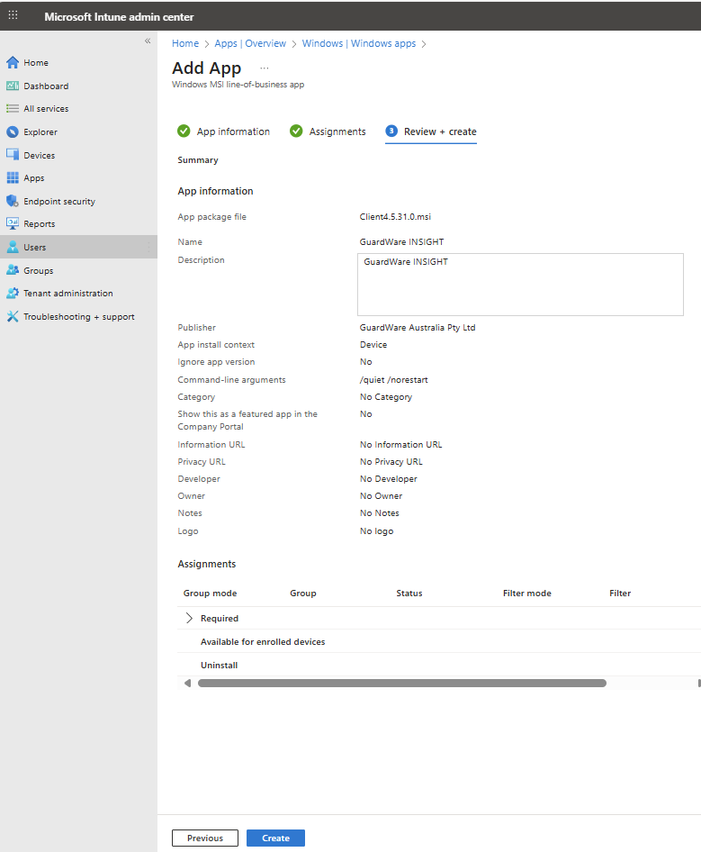 To install GuardWare INSIGHT Agent using Microsoft INTUNE: