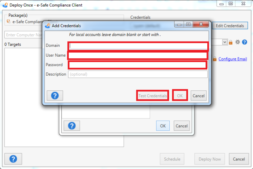 Enter the Domain, User Name (administrator account), Password, and click Test Credentials to verify access, then click OK.