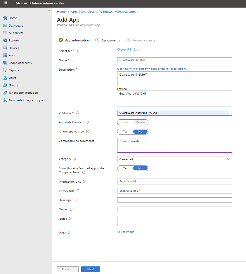 You can deploy GuardWare INSIGHT Agent across multiple endpoint devices using Microsoft Intune. This method enables centralised and automated installation of the client on enrolled Windows devices, ensuring consistent deployment across your organisation.