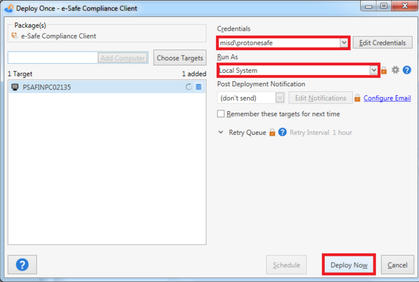 Select the appropriate Credentials and ensure Run as Local System is set to Yes.